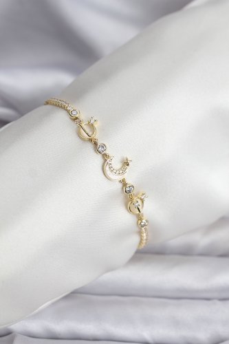 Charmlı Model Zirkon Taşlı Gold Renk Su Yolu Kadın Bileklik