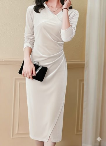 Kadın uzun kollu kruvaze yakalı yandan büzgülü önden çapraz detaylı midi kadife elbise