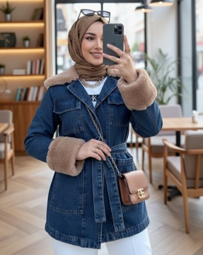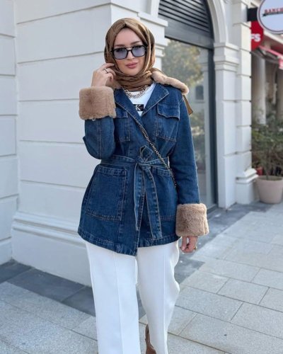 • Yakası Ve Kolu Kürklü Önü Bağlamalı Cepli Kot Ceket İndigo