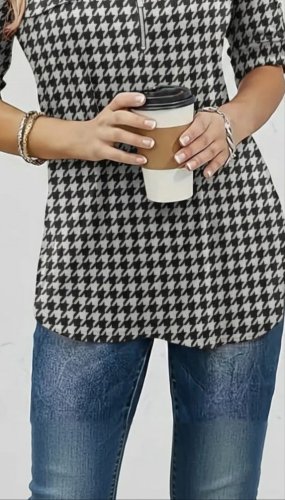 • Kadın uzun kollu hakim yaka yakadan fermuarlı geometrik desenli süprem bluz
