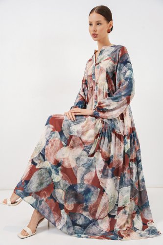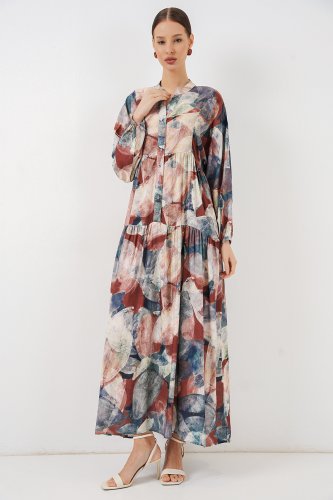 Desenli Uzun Tesettür Elbise 2585 A Kiremit